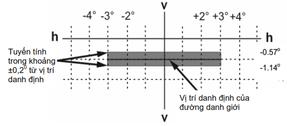 4.1.3. Độ tuyến tính: phần của đường ranh giới mà dùng để điều chỉnh dọc sẽ nằm ngang từ vị trí -3º hoặc -1310 mm đến +3º hoặc +1310 mm đối với đường V-V. Yêu cầu này được cho là thỏa mãn nếu các vị trí dọc của các điểm có G lớn nhất trên các đường thẳng lần lượt cách đường V-V về hai phía góc 1,5º hoặc 655 mm, 3º hoặc 1310 mm (Hình 2) không khác quá 0,2º hoặc 87 mm đối với lớp B và 0,3º hoặc 130 mm đối với loại A, C và D, E từ vị trí của đường ranh giới.