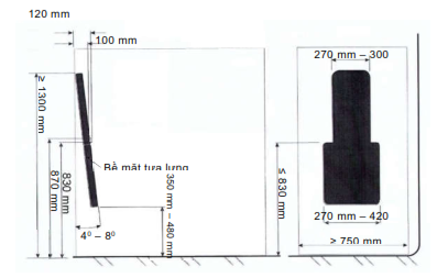 c) Bề mặt đệm tựa lưng hướng về phía sau xe phải thỏa mãn các kích thước như hình 2.