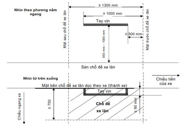 2.2.1.3.1.4.3. Khi đo theo phương nằm ngang về phía sau xe, đầu phía trước của tay vịn cách mặt trước của chỗ để xe lăn không quá 300 mm, đầu còn lại cách mặt trước này ít nhất 1.000 mm;