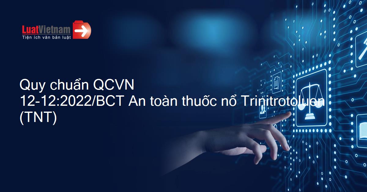 QCVN 12 - 12:2022/BCT do Tổ soạn thảo Quy chuẩn kỹ thuật Quốc gia về an toàn sản phẩm vật liệu nổ công nghiệp - thuốc nổ Trinitrotoluen biên soạn, Cục Kỹ thuật an toàn và Môi trường công nghiệp trình duyệt, Bộ Khoa học và Công nghệ thẩm định, Bộ trưởng Bộ Công Thương ban hành theo Thông tư số /2022/TT-BCT ngày tháng 10 năm 2022.