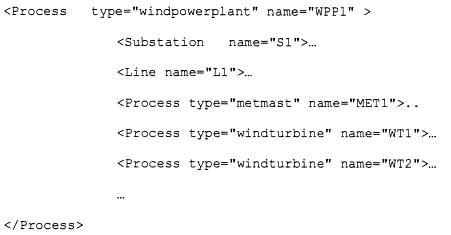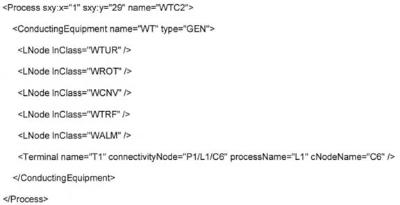 Phần tử Quá trình không bao gồm ConnectivityNodes hoặc VoltageLevels để mô hình cấu trúc liên kết điện trong tuabin gió. Các phần tử ConnectivityNode và VoltageLevel đã được thêm vào phần tử Process xml.