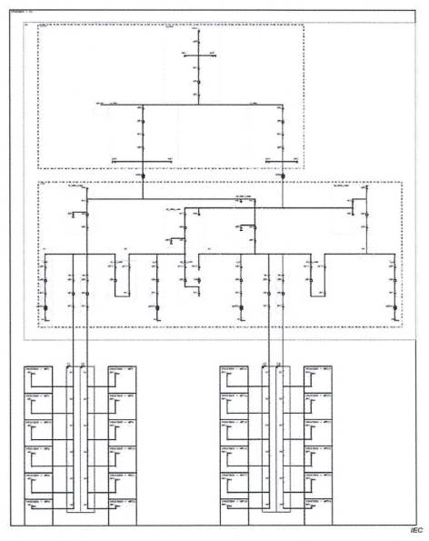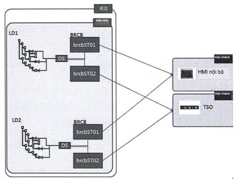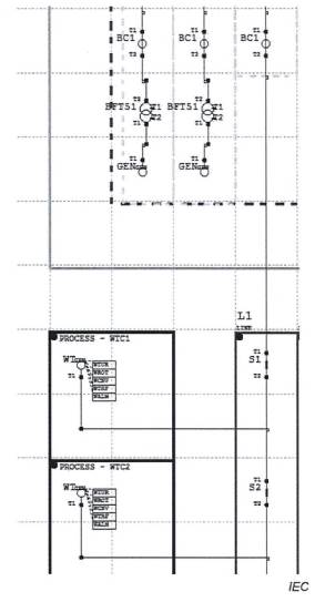 Đoạn Quá trình/Trạm biến áp bao gồm cấu trúc liên kết của nhà máy điện gió, LNode được liên kết với các IED khác nhau cung cấp thông tin.