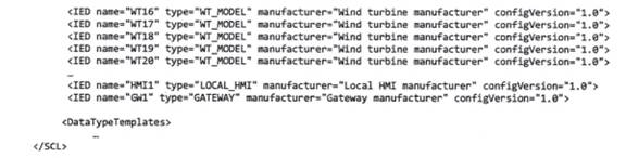 Đoạn IED bao gồm một IED cho từng WT trong dự án. Các thiết bị thuộc TCVN 10687-25 (IEC 61400-25) hoặc thiết bị thuộc IEC 61850 khác cũng được mô hình hóa dưới dạng IED trong tệp SCD.