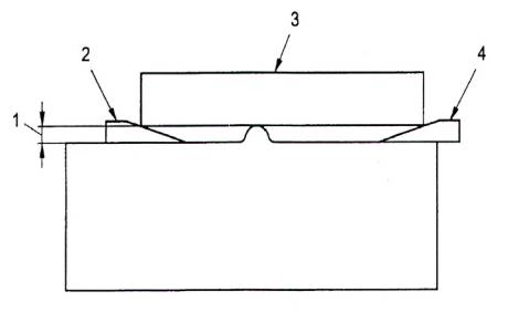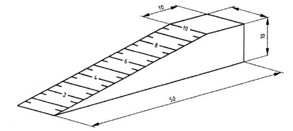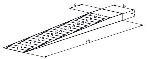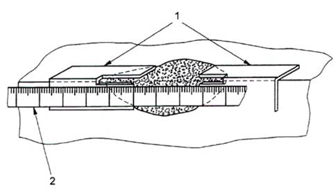 Đo chiều cao của vết lồi từ bềmặt mẫu bằng thanh thép thẳng (4.3) và các nêm (4.4), độ chính xác đến 0,5 mm. Đặt thước thẳng song song với bề mặt, tiếp xúc với vết lồi và điều chỉnh nêm để hiển thị các giá trị bằng nhau trên mỗi nêm, như trong Hình 10.