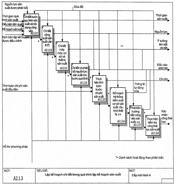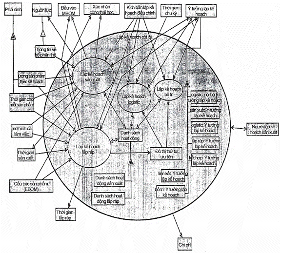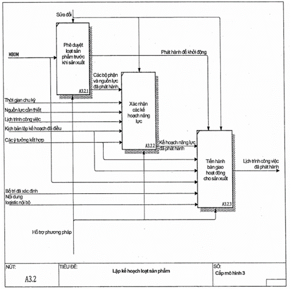 Các chức năng lập kế hoạch liên quan chuyển kịch bản lập kế hoạch đã chọn và thông tin lập kế hoạch tương ứng từ các bộ phận lập kế hoạch vào hệ thống sản xuất cuối cùng (A3.2 trong Hình A.1). Quản lý quá trình sản xuất có thể dẫn đến một lần lặp lại tiếp theo của các quá trình lập kế hoạch. Mỗi lần lặp lại tạo ra một lịch trình công việc được cập nhật giúp cải tiến hệ thống sản xuất. Yêu cầu lặp lại được kích hoạt các quá trình cải tiến liên tục hoặc thay đổi các điều kiện khung công việc được mô tả trong AX Cuối cùng, nó kết thúc bằng việc phát hành lịch trình công việc cuối cùng cho biết quá trình quản lý kết thúc sản xuất (EOP).