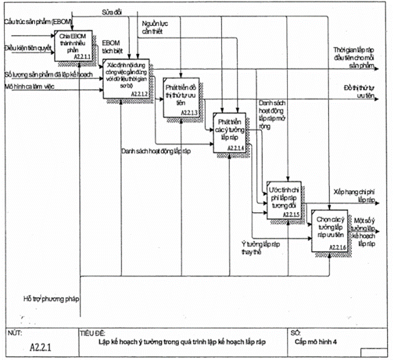 Do đó, các biến đầu ra từ quá trình lập kế hoạch lắp ráp, chẳng hạn như đồ thị thứ tự ưu tiên, loại và số lượng trạm công việc được xác định trên cơ sở các ý tưởng lập kế hoạch đồng thời là các biến đầu vào cho quá trình lập kế hoạch ý tưởng. Số lượng, loại và kích thước gần đúng của các trạm công việc như một hàm của sản phẩm đang xem xét cũng là các biến đầu vào. Ngoài quá trình lập kế hoạch lắp ráp trong giai đoạn lập kế hoạch ý tưởng, quá trình lập kế hoạch bố trí được tiến hành trong cùng giai đoạn để xác định bản chất và yêu cầu về không gian của các ý tưởng ban đầu (A2.4.1.1). Điều đặc biệt quan trọng là phải tính đến ước tính sớm để xem xét quá trình lập kế hoạch bố trí kết hợp với các ý tưởng lập kế hoạch còn lại. Những điều này phát sinh từ các nguyên tắc cốt lõi nhằm mục đích điều chỉnh kịch bản lập kế hoạch. Các ý tưởng bố trí cho phép xem xét thêm trong quá trình tham chiếu như ước tính chi phí.
