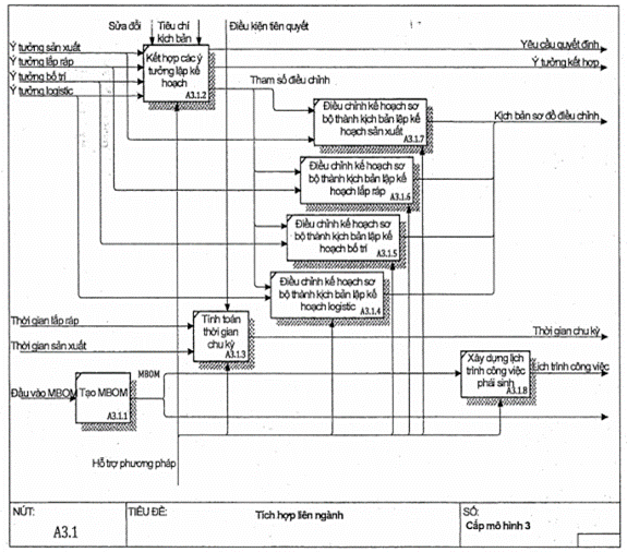Tích hợp liên ngành bao gồm ba hoạt động cơ bản của quá trình xử lý thông tin. Để kết hợp thông tin tương ứng thu thập được từ tất cả các nguyên tắc lập kế hoạch, tích hợp liên ngành tạo ra một MBOM tích hợp dựa trên các đầu vào MBOM (A3.1.1 trong Hình A.2). MBOM tích hợp sẽ được sử dụng để lấy lịch trình công việc chưa phát hành (A3.1.8 trong Hình A.2) và sẽ được chuyển giao cho bộ phận quản lý quá trình sản xuất. Các đầu ra chi tiết từ các nguyên tắc lập kế hoạch cốt lõi như thời gian sản xuất và lắp ráp được tính toán trong tích hợp liên ngành.