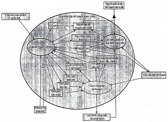 Cấu trúc của các chức năng lập kế hoạch liên quan như thể hiện trong Hình A.1 bao gồm các chức năng lập kế hoạch có tính chất liên ngành. Nhiều đầu ra từ các nguyên tắc lập kế hoạch cốt lõi cần được kết hợp, bổ sung và điều chỉnh. Việc xử lý thông tin cần thiết phụ thuộc rất nhiều vào việc xem xét đồng thời các loại thông tin liên ngành như thời gian, ý tưởng và đầu vào MBOM. Sự tích hợp liên ngành mang lại các kịch bản lập kế hoạch được điều chỉnh và có ảnh hưởng đáng kể đến việc lập kế hoạch chi tiết của các nguyên tắc cốt lõi cũng như đến việc quản lý quy trình sản xuất.