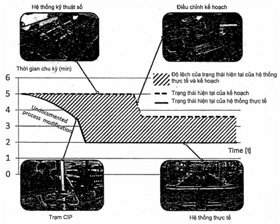 Tài liệu áp dụng cho việc tạo, đưa vào vận hành và vận hành hệ thống sản xuất được cung cấp bởi tài liệu lập kế hoạch. Khi bắt đầu sản xuất, các tài liệu và định nghĩa của các phòng ban lập kế hoạch đóng vai trò là tài liệu tham khảo cho mọi thứ. Sau đó, một số biện pháp mới thường xuất hiện, thực tế hơn so với các biện pháp đã lập kế hoạch ban đầu và chúng là những biện pháp cuối cùng được triển khai. Hình A.1 cung cấp một ví dụ về cách trạng thái thực tế của hệ thống có thể lệch khỏi trạng thái đã lập kế hoạch theo thời gian. Có nhiều cách khác nhau để xảy ra sai lệch so với trạng thái đã lập kế hoạch. Ví dụ, việc cải tiến liên tục đối với quy trình thường làm giảm thời gian cơ bản cần thiết để hoàn thành quy trình, do đó trực tiếp tăng hiệu quả của quy trình. Tất nhiên, cũng có thể có những điều chỉnh hoàn toàn khác, ví dụ như liên quan đến công thái học hoặc năng lực gia công. Những điều này không thể dễ dàng được lập bản đồ và đánh giá trực quan. Ngoài ra, các tác nhân gây ra thay đổi có thể thay đổi đáng kể và chúng có thể được nhiều bên xác định và đề xuất. Bắt đầu từ khi quá trình sản xuất ban đầu được triển khai, nhiều thay đổi được đưa ra sau đó sẽ đại diện cho quá trình sản xuất thực tế tại bất kỳ thời điểm nào. Trong ngữ cảnh của các hệ thống sản xuất toàn diện, khả năng thích ứng của các quá trình sản xuất là rất quan trọng đối với khả năng cạnh tranh. Hiệu quả toàn diện thường được yêu cầu tăng lên hàng năm, tạo ra nhu cầu mạnh mẽ về việc hợp lý hóa. Để thích ứng và tối ưu hóa quy trình một cách lâu dài, tài liệu lập kế hoạch sớm muộn gì cũng phải lệch khỏi trạng thái thực tế của hệ thống sản xuất, tức là tất cả các nhà sản xuất đều trải nghiệm các quá trình sản xuất của họ lệch khỏi kế hoạch ban đầu ở một mức nào đó. Tuy nhiên, để kiểm tra, đánh giá và đạt được các mục tiêu đã đặt ra về chất lượng, thời gian cần thiết và hiệu quả về chi phí, kế hoạch cần phải được so sánh liên tục với trạng thái thực tế. Bất kỳ thay đổi nào đối với quá trình sản xuất và kế hoạch đều diễn ra trong quá trình lặp đi lặp lại đòi hỏi sự đồng thuận của nhiều người tham gia.