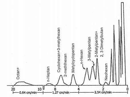 Các cấu tử trong mẫu đại diện được phân tách vật lý bằng sắc ký khí (GC) và được so sánh với các dữ liệu hiệu chuẩn thu được từ hỗn hợp chuẩn quy chiếu có thành phần đã biết trong cùng một điều kiện vận hành. Có thể nhóm các cẩu tử nặng cuối mẫu thành các pic không đều bằng cách đảo chiều dòng khí mang qua cột, đồng thời nhóm các cấu tử nặng cuối mẫu như C5+, C6+ hoặc C7+. Thành phần của mẫu được tính bằng cách so sánh các chiều cao của pic hoặc diện tích pic, hoặc cả hai với các giá trị tương ứng nhận được từ chất chuẩn quy chiếu.