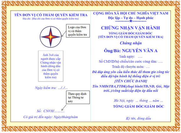 9. Chứng nhận vận hành là giấy chứng nhận do Đơn vị điều độ hệ thống điện quốc gia, cấp điều độ có quyền điều khiển hoặc điều độ cấp trên cấp cho các chức danh tại các cấp điều độ, trạm điện, nhà máy điện và trung tâm điều khiển tham gia trực tiếp công tác điều độ, vận hành hệ thống điện quốc gia sau khi được đào tạo và kiểm tra.