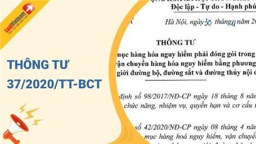 Ngày 30/11/2020, Bộ Công Thương đã ban hành Thông tư 37/2020/TT-BCT quy định Danh mục hàng hóa nguy hiểm phải đóng gói trong quá trình vận chuyển và vận chuyển hàng hóa nguy hiểm bằng phương tiện giao thông cơ giới đường bộ, đường sắt và đường thủy nội địa.