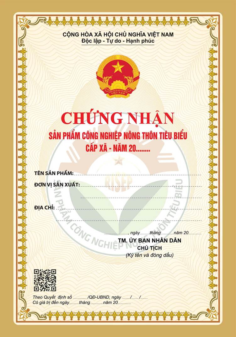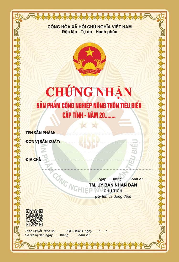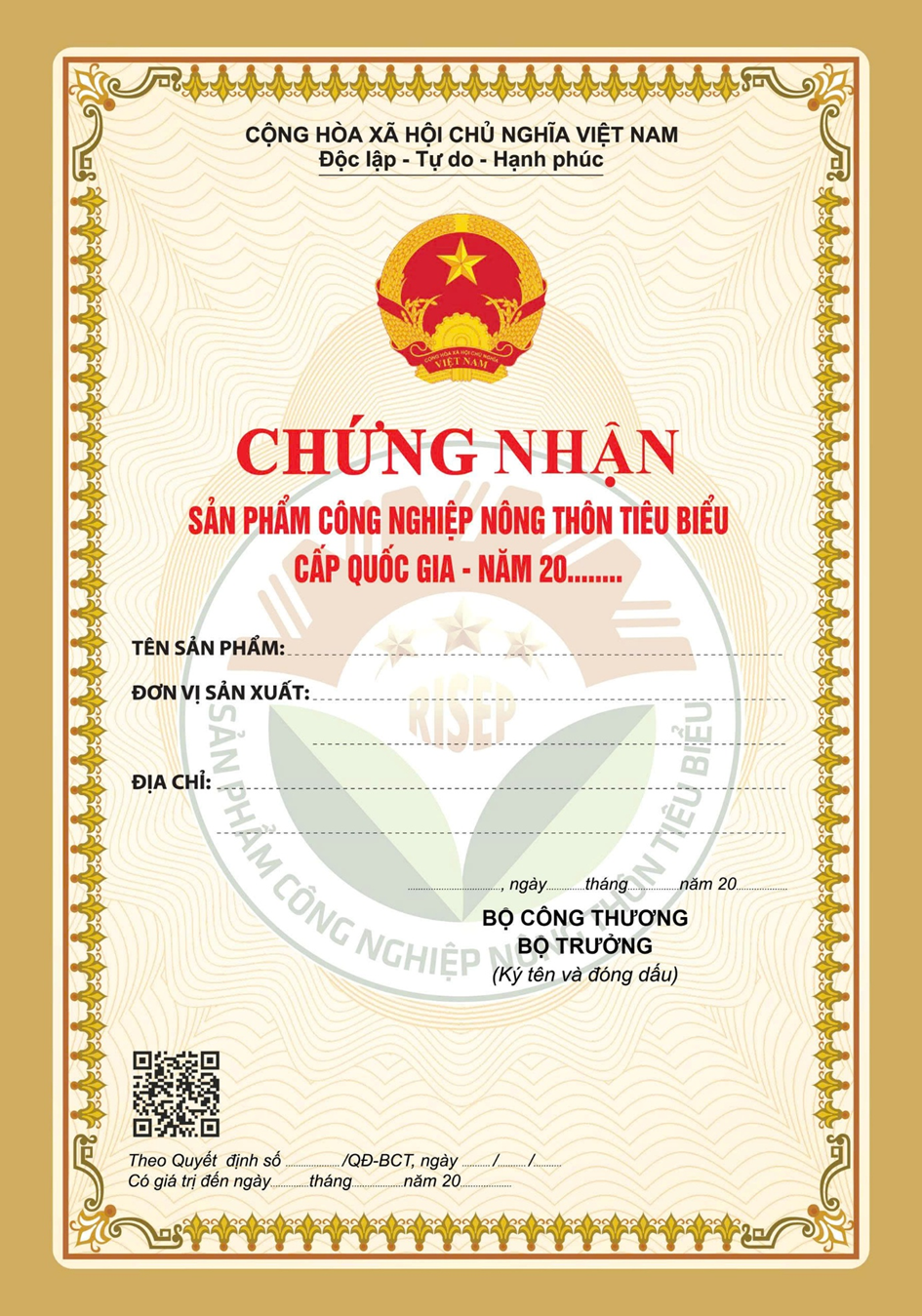 3. Nội dung: Dòng thứ 1, 2: Quốc hiệu “CỘNG HÒA XÃ HỘI CHỦ NGHĨA VIỆT NAM, Độc lập - Tự do - Hạnh phúc”; ngay dưới, chính giữa là biểu tượng Quốc huy Việt Nam. Dòng thứ 3: “CHỨNG NHẬN” (chữ in hoa, màu đỏ); Dòng thứ 4: “SẢN PHẨM CÔNG NGHIỆP NÔNG THÔN TIÊU BIỂU”. Dòng thứ 5: CẤP...- NĂM 20…” (chữ in hoa, màu đỏ). Dòng thứ 6: “TÊN SẢN PHẨM/BỘ SẢN PHẨM”: ghi tên sản phẩm. Dòng thứ 7: “ĐƠN VỊ SẢN XUẤT: ghi tên đơn vị sản xuất sản phẩm. Dòng thứ 8: “ĐỊA CHỈ”: ghi địa chỉ của đơn vị sản xuất sản phẩm. Phía dưới bên phải gồm các nội dung: địa danh, ngày … tháng … năm…; chức danh người ký và khoảng trống 30mm để ký tên và đóng dấu. Phía dưới bên trái gồm các nội dung: Mã QR code, kích thước tối thiểu (2×2) cm, tùy theo bố cục có thể mở rộng không quá (3×3) cm để đảm bảo khả năng quét tốt; các dòng chữ: “- Số quyết định … ngày … tháng …năm 20…”, “- Có giá trị đến hết ngày … tháng …năm 20…”.