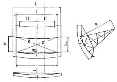 1.2. Định nghĩa: Cửa van cung: Cửa van cung có mặt chắn nước hình cong, chuyển động xoay quanh trục để nâng lên hạ xuống theo yêu cầu. Thường làm với khẩu độ: B (rộng) x H (chiều cao) từ 8 x 5 m đến 20 x 11 m với diện tích thông nước mặt. Với diện thông nước sâu, có thể có diện tích 30 m2 đến 40 m2. Việc nâng, hạ cửa van cung được thực hiện bằng máy nâng đặt ở trụ pin hay trên cầu công tác có hệ thống dây cáp hoặc thanh truyền lực gắn với cửa.