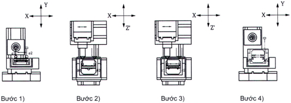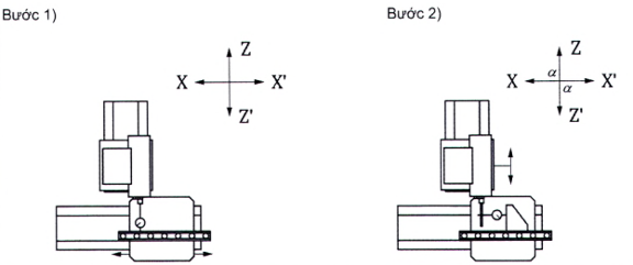 3) Xoay trục B' tới vị trí 90° (bàn máy vuông góc với đường tâm trục chính). Với đồng hồ so theo phương trục Z tiếp xúc với mặt trên thước thẳng ở cùng hai vị trí giống như ở 1), lây các số đọc ở c1 và c2 và ghi lại độ chênh lệch Δc = (c2 - c1).