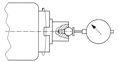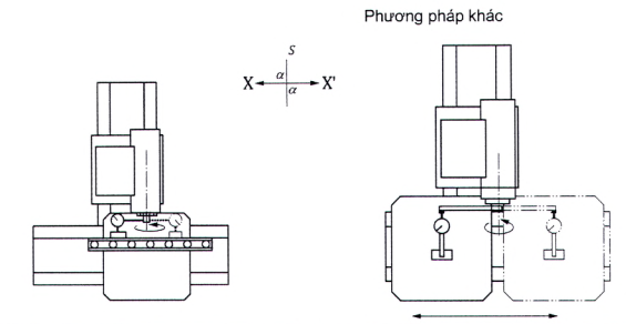 | Xem và tham chiếu ISO 230-1 1) Điều chỉnh trục B' của bàn xoay cho đến khi trục quay A' của bàn máy vuông góc với trục Z. 2) Di chuyển trục Y đến vị trí thẳng đứng tại đó trục quay A' của bàn máy và đường tâm trục chính cần nằm trong cùng mặt phẳng ZX. 3) Cố định trục kiểm trong trục chính và đồng hồ so trên bàn máy với đầu đo song song với bề mặt bàn máy theo phương hướng kính. 4) Với đầu đo đồng hồ so được định hướng thẳng đứng theo phương trục Y tiếp xúc với trục kiểm, gần với đầu mút trục chính, và tìm số đọc lớn nhất của đồng hồ so bằng các dịch chuyển nhỏ dọc theo trục X. Đưa đồng hồ so về không. 5) Di chuyển trục X để đưa trục kiểm ra xa đồng hồ so. Xoay cả bàn mày và trục chính góc 180°, và đưa trục kiểm trở lại tiếp xúc với đồng hồ so bằng cách dịch chuyển trục X. 6) Tìm số đọc lớn nhất của đồng hồ so bằng các dịch chuyển nhỏ dọc theo trục X. 7) Giá trị nửa số đọc mới này trên đồng hồ so là sai số sẽ được báo cáo. Cần của đồng hồ so phải đủ cứng vững để ngăn ngừa bất kỳ sai số số đọc có thể có nào gây ra do độ võng của nó ở các vị trí đo khác nhau. CHÚ THÍCH 1: Nếu phép kiểm này được thực hiện ở các vị trí khác nhau của trục Z, nó sẽ bị ảnh hưởng bởi sai số độ song song E A(0Z)(C) giữa đường tâm trục chính và trục Z và ảnh hưởng bởi sai số độ vuông góc thẳng đứng E YZ của trục Z. CHÚ THÍCH 2: Nếu phép kiểm này được thực hiện ở các vị trí khác nhau của trục X, nó sẽ bị ảnh hưởng bởi sai số độ song song E C(0Z)(A) giữa trục quay A' của bàn máy và trục X và ảnh hưởng bởi sai số độ vuông góc thẳng đứng E YX của trục X. | |