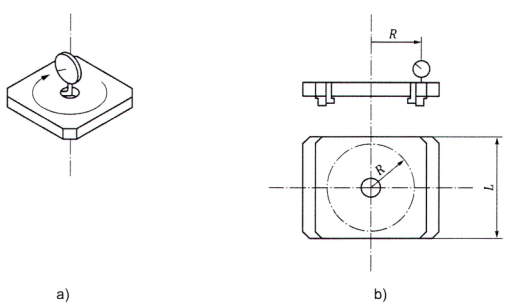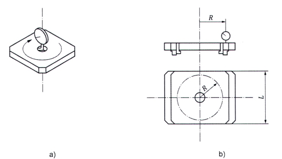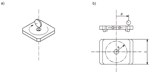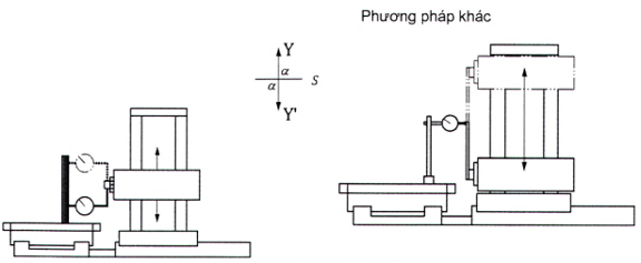 | Xem và tham chiếu 10.3 và 10.3.3, ISO 230-1:2012 a) Trục X được khóa lại nếu có thể. b) Trục Z được khóa lại nếu có thể. Đặt một căn mẫu lên một cạnh bàn máy, theo phương Y cách xa so với trục quay; cố định đồng hồ so trên trục chính nếu nó có thể khóa được, hoặc trên ụ trục chính; đưa đầu đo vào tiếp xúc với căn mẫu và chỉnh đồng hồ so về không. Xoay bàn máy góc 180° và dịch chuyển trục Y cho đến khi đầu đo chạm lại vào căn mẫu tại cùng một vị trí. Số đọc của đồng hồ so chia cho khoảng dịch chuyển Y là sai số sẽ được báo cáo. Ghi lại chiều của sai số. Quy ước ký hiệu của sai số phải tương ứng với ký hiệu độ vuông góc theo 3.6.7, Chú thích 2, ISO 230-1:2012. Phép kiểm a) có thể bị ảnh hưởng bởi sai số độ thẳng E XY của trục Y và phép kiểm b) có thể bị ảnh hưởng bởi sai số độ thẳng E ZY . | |||