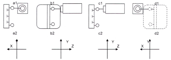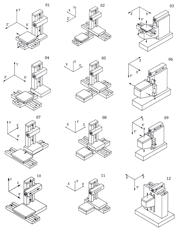 Hình 1 và Bảng 1 thể hiện các dạng cấu hình có thể có của các trung tâm gia công, với các cấu trúc khác nhau và các bộ phận khác nhau di chuyển dọc theo các trục tịnh tiến. Các dạng cấu hình này được nhận biết bằng các số từ 01 đến 12 tham chiếu Hình 1 và Bảng 1. Đối với hướng và tên gọi các trục, nên tham chiếu ISO 841.