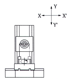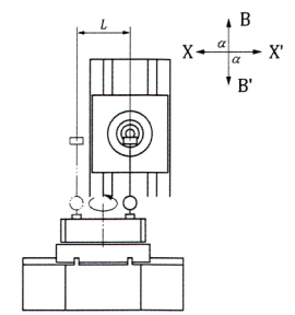 | Kiểm sai số độ vuông góc E B(0X)A của trục quay A' của bàn máy, hoặc của bộ nhận, với bàn máy vuông góc với đường tâm trục chính (B' = 90°), với chuyển động trục X | |