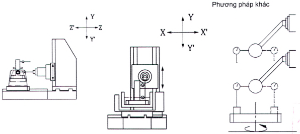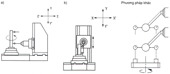 | Phương tiện đo Trục kiểm, các đầu dò không tiếp xúc và phương tiện đo góc hoặc hai khối cầu chính xác được đặt hơi lệch tâm với đường trung bình của bàn máy và các đầu dò không tiếp xúc | ||||