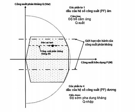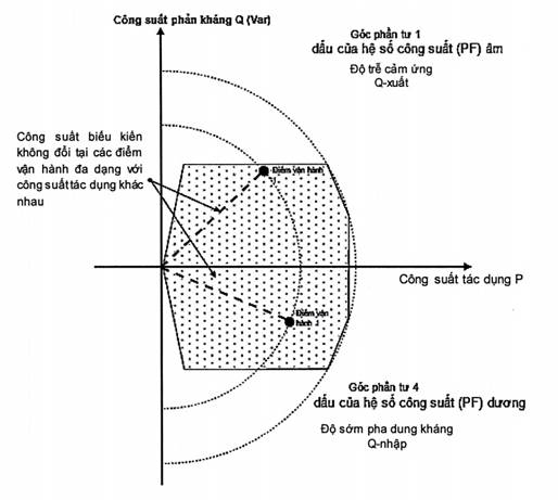 a) Điều khiển công suất phản kháng - có thể áp dụng để điều khiển điểm vận hành trong giới hạn do mã đấu nối đưa ra (xem Hình D.7).
