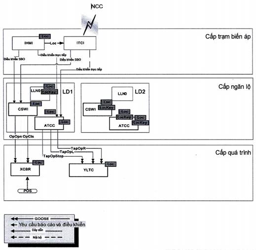 Hình F.2 thể hiện trường hợp sử dụng điển hình. Dữ liệu có thể điều khiển LocSta (tùy chọn) được sử dụng để chặn các hành động điều khiển đến từ NCC. Các hành động điều khiển đến từ cấp trạm biến áp vẫn được cho phép. Trạng thái LocSta được điều khiển từ cấp trạm biến áp LN IHMI. Việc kiểm tra sự chấp nhận các hành động điều khiển từ NCC được thực hiện ở cấp độ ngăn. Đây là giải pháp ưu tiên nhưng cần lưu ý rằng LocSta cũng có thể được sử dụng ở cấp độ IHMI/ITCI, ví dụ như đối với các SC dự phòng.