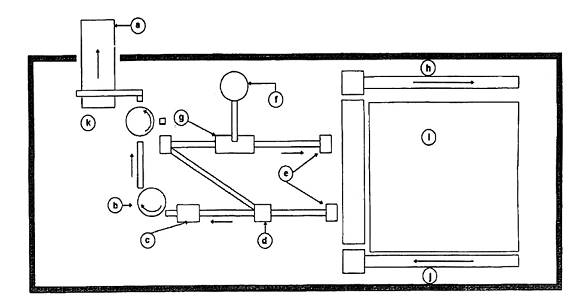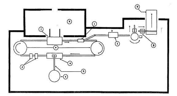 | a) Băng tải vận chuyển ngói đã đóng gói ra ngoài b) Bàn quay c) Bộ phận xử lý bề mặt d) Dỡ tấm pallet e) Giàn thu gom f) Máy trộn1) | g) Máy sản xuất ngói2) h) Hệ thống vận chuyển ngang (phía ướt)1) i) Khu vực dưỡng hộ3) j) Hệ thống vận chuyển ngang (phía khô)1) k) Khu vực đóng gói sản phẩm <- Hướng di chuyển4) |