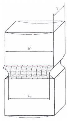 - Đối với vết khía cạnh, chiều dài kiểm tra Lf phải lớn hơn hoặc bằng 70 % chiều rộng ban đầu của mẫu thử, w (xem Hình 6), hoặc tổng chiều dài kiểm tra, ΣLf phải lớn hơn hoặc bằng 60 % chiều dài của mẫu thử;