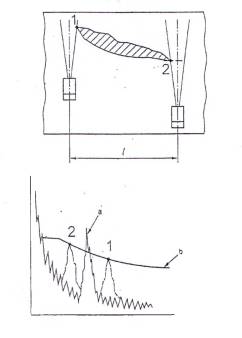 Để thực hiện một phép đo, chùm tia được cho quét trên các chỉ thị, vị trí đầu dò và phạm vi đường đi chùm tia tại đó âm dội rơi vào mức đánh giá, được đánh dấu lại (các vị trí 1 và 2 trên Hình B.1).