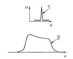 Đáp ứng của vật phản xạ nhẵn mở rộng được thể hiện trên Hình C.2. Tại vị trí bất kỳ của đầu dò, quét A chỉ ra một âm dội nhọn đơn lẻ. Khi chùm siêu âm được di chuyển trên vật phản xạ, âm dội này tăng một cách trơn chu đến một giá trị ổn định và được duy trì, với các biến đổi nhỏ về biên độ đến 4 dB, cho đến khi chùm tia dịch chuyển khỏi gương phản xạ, khi đó âm dội giảm một cách trơn chu xuống mức nhiễu.