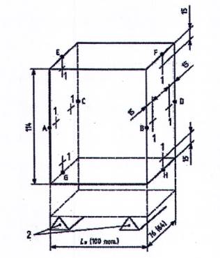 Thực hiện bốn phép đo trên mỗi mẫu thử, chính xác đến 0,2 mm, khoảng cách L0 giữa hai mặt đối diện của mẫu thử trên danh nghĩa là 100 mm. Thực hiện hai phép đo song song với đường chia đôi của mặt trên và mặt dưới mẫu thử (EF và GH như Hình 1), cách các cạnh của các mặt đó xấp xỉ 15 mm, và hai phép đo song song với đường chia đôi của mặt trước và mặt sau của mẫu thử (AB và CD), cách các cạnh của các mặt đó xấp xỉ 15 mm. Đánh dấu các vị trí đo bằng mực chịu lửa.