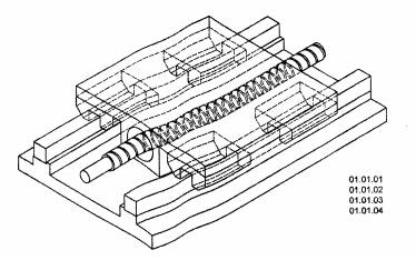 CHÚ THÍCH Bản vẽ phác điển hình của một hệ thống dẫn hướng thẳng có bàn trượt bi hoặc bộ phận dẫn hướng trên ray định hình với bàn trượt con lăn. Các kết cấu khác có thể gồm có các bộ phận dẫn hướng trên ray thẳng hoặc các bộ phận dẫn hướng trên trục thẳng theo các Hình 2 đến 16.