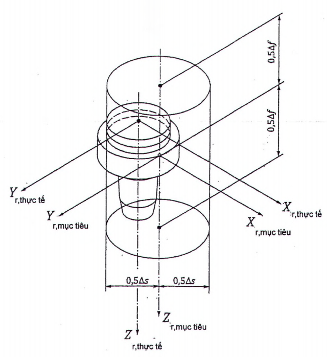 Chú thích 2: Dung sai chiều dài ghép nối của phần rô bốt (L cr ) và chiều dài ghép nối của phần dụng cụ (L ct ) có tác động đáng kể đến độ chính xác tư thế của toàn bộ hệ thống khi sử dụng các công cụ khác nhau. Chiều dài của hệ thống ghép nối được tính là L t ổ ng ± Δ