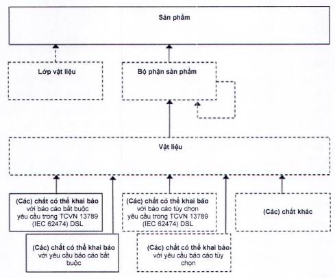 | Ngưỡng báo cáo | Tùy chọn | Hàm lượng chất tính bằng phần trăm khối lượng của khối vật chất đồng nhất. Phần trăm khối lượng được tính toán như quy định trong cơ sở dữ liệu TCVN 13789 (IEC 62474) nếu yêu cầu báo cáo được cung cấp. | |||