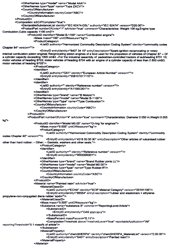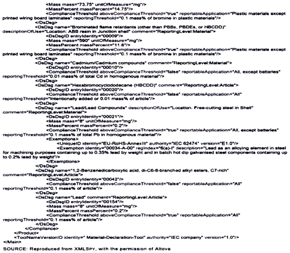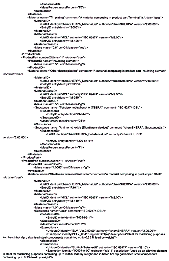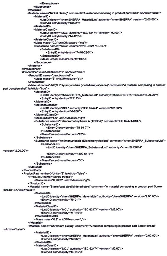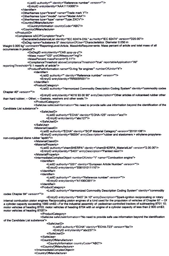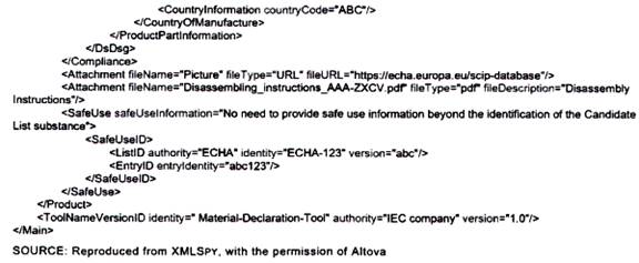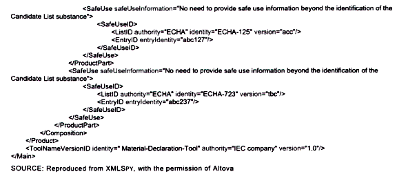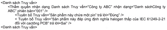 | CHÚ THÍCH: Bởi vì các bình luận được hâu hết các công cụ tự động hóa diễn giải như chỉ mang tính chất thông tin, nên có thể không có hành động nào được thực hiện dựa trên bình luận này. Điều này có thể tạo ra một phán quyết sai lầm trong một công cụ tự động hóa mà ở đó một yêu cầu mang tính pháp lý vô tình được kích hoạt bởi công bố này. Đối với ví dụ trên, công cụ tự động hóa có thể diễn giải một cách không chính xác việc liệt kê B2O3 như một REACH SVHC trong sản phẩm. | ||