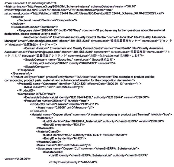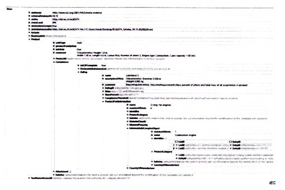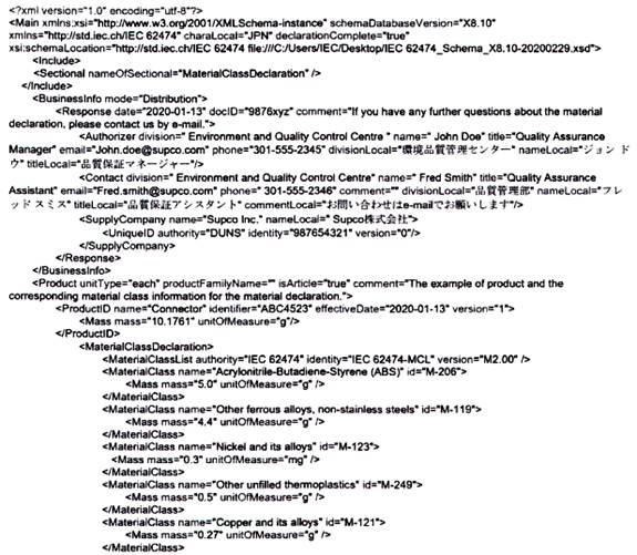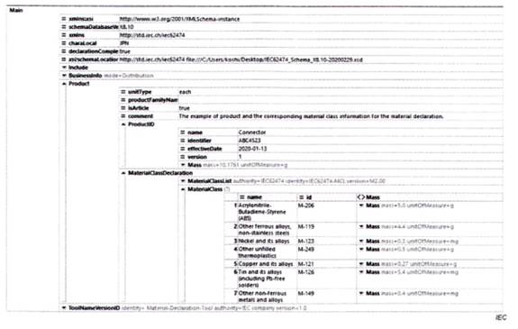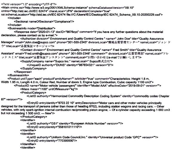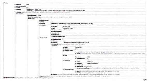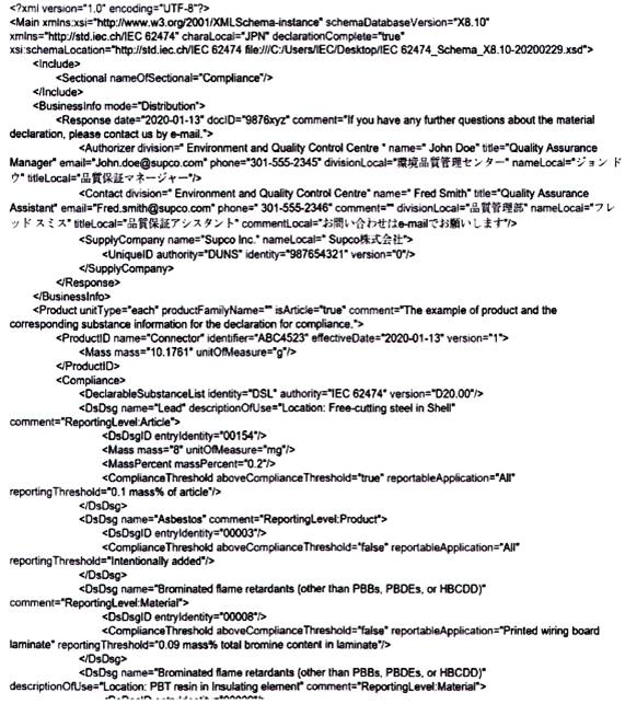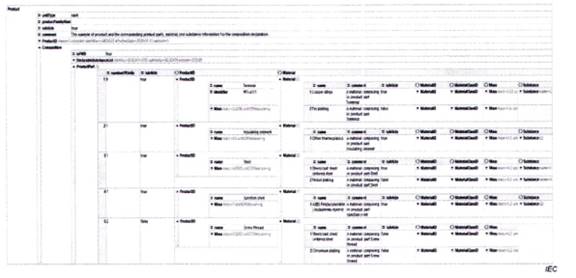 Tiêu chuẩn TCVN 13789 (IEC 62474) bao gồm một số phần, bao gồm DXF, DSL, danh sách lớp vật liệu (MCL) và các danh sách miễn trừ (EL). Một công bố vật liệu có thể sử dụng bất kỳ hoặc tất cả các phần này. TCVN 13789 (IEC 62474) nêu rõ rằng một công bố vật liệu hoàn toàn phù hợp với TCVN 13789 (IEC 62474) sẽ sử dụng, tối thiểu, là TCVN 13789 (IEC 62474) DXL và DSL. Tiêu chuẩn đó cũng nêu rõ rằng một công bố vật liệu có thể chỉ phù hợp với TCVN 13789 (IEC 62474) DXF hoặc chỉ với TCVN 13789 (IEC 62474) DSL, nhưng nếu vậy, công bố đó chỉ có thể công bố phù hợp với các phần cụ thể của tiêu chuẩn được sử dụng. Các công bố được chấp nhận để công bố sự phù hợp được cung cấp trong TCVN 13789 (IEC 62474).