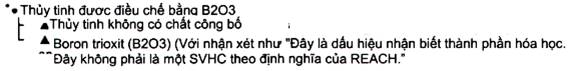 | B2O3 (Với bình luận như "Đây là ký hiệu nhận dạng của thành phần hóa học. Đây không phải là một SVHC theo định nghĩa của REACH.") | 15 | |