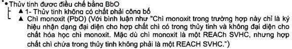| Chì/Các hợp chất chì | 74,3 | PbO (Với bình luận như "Đây là ký hiệu nhận dạng thành phần hóa học. Hợp chất chì trong thủy tinh không phải là một SVHC như REACH đã định nghĩa.") | 80 | |