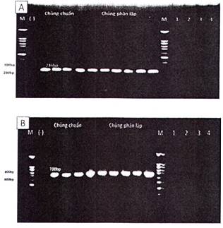 Hình C.1. Kết quả điện di sản phẩm PCR khuếch đại gen (A) gen XRE (~ 246 bp) và (B) Cry2 (~ 700 bp)