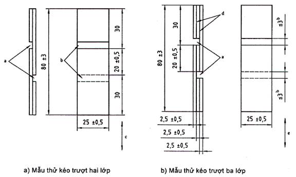 e) loại mẫu được sử dụng, nghĩa là hai lớp hoặc ba lớp, hướng của lớp giữa (xem 5.2.2) và kích thước của vùng cắt liên kết khi được gia công;
