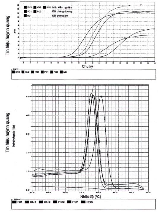 Hình B. Kết quả real-time PCR của đối chứng dương, mẫu kiểm nghiệm và đối chứng âm