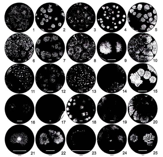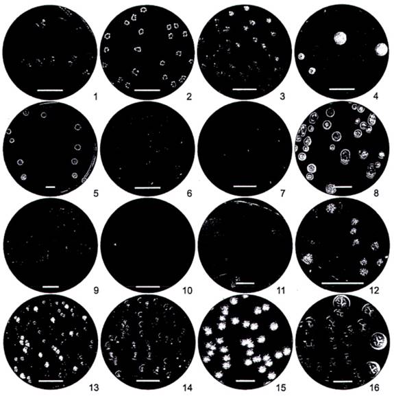 1 - 8 B. pumilus; 9-11 B. licheniformis; 12 B. claussi; 13-14 B. subtilis; 15-16 B. megaterium.