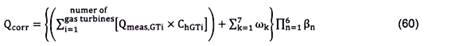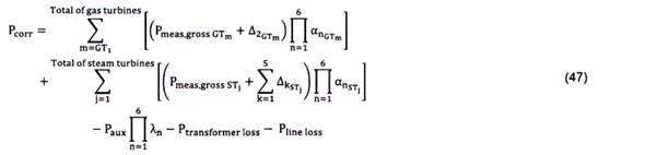 Các thuật ngữ bên trái đại diện cho suất tiêu hao nhiệt đã hiệu chỉnh và nhiệt đầu vào đã hiệu chỉnh, tương ứng với những gì chúng sẽ có với (các) bộ làm mát bay hơi/dàn phun sương được sử dụng trong quá trình thí nghiệm nhà máy. Các thuật ngữ đầu tiên ở phía bên phải của công thức đại diện cho suất tiêu hao nhiệt đã hiệu chỉnh hoặc nhiệt đầu vào đã hiệu chỉnh với bộ làm mát của thiết bị bay hơi hoặc thiết bị ngừng hoạt động theo các công thức thích hợp trong mục 5.3 và được hiệu chỉnh theo các điều kiện tham chiếu cơ bản tại đầu vào của thiết bị xử lý khí đầu vào. Các thuật ngữ K là hệ số hiệu chỉnh để điều chỉnh hiệu suất của nhà máy được thí nghiệm với (các) bộ làm mát bay hơi hoặc (các) bộ làm mát bay hơi không hoạt động so với hiệu suất mà thiết bị đó đang sử dụng, dựa trên mô hình nhiệt của toàn bộ thí nghiệm phạm vi.