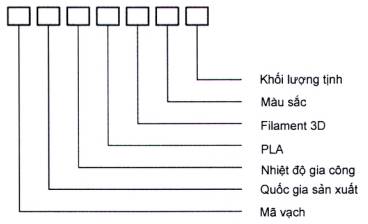 Sản phẩm phải được ghi nhãn với các thông số kỹ thuật: mã vạch, quốc gia sản xuất, nhiệt độ gia công, tên vật liệu, filament 3D, màu sắc và khối lượng tịnh như thể hiện trong Hình 1.
