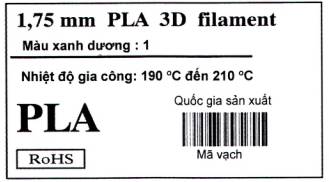 VÍ DỤ: Vật liệu filament PLA xanh dương có đường kính 1,75 mm, với khối lượng tịnh 1 kg phải được ký hiệu là filament 3D PLA màu xanh dương 1,75 mm: 1 kg như trong Hình 2.
