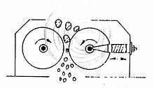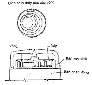 CHÚ THÍCH - Quặng được đặt trong khoảng giữa các vòng, vỏ máy và đĩa ở tâm. Quá trình nghiền được thực hiện trên bàn chấn động có kẹp các ngàm nghiền.