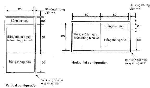 5.3. Hình dạng đứng thường được ưa dùng tuy nhiên dạng nằm ngang cũng có thể chấp nhận được. Sự lựa chọn cuối cùng đối với hình thức và dạng ký hiệu an toàn được xác định bởi các yếu tố sau: bất kỳ sự lựa chọn nào được đánh giá là có tác dụng thông báo đạt hiệu quả nhất, các vùng địa lý và ngôn ngữ mà ở đó sản phẩm sẽ được tiêu thụ; các yêu cầu có liên quan tới luật pháp và không gian có được dành cho ký hiệu báo nguy hiểm.