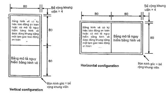 5.6. Ký hiệu báo nguy hiểm hai bảng (Two-panel safety signs): bảng hình vẽ, bảng thông báo. Xem hình 3. Bảng hình vẽ cũng chứa đựng hình vẽ minh họa mối nguy hiểm được đóng khung bằng một tam giác báo động nguy hiểm hoặc chỉ có riêng ký hiệu báo động nguy hiểm. Bảng thông báo gồm có bản thông báo mô tả mối nguy hiểm, giải thích những hậu quả do đối mặt với nguy hiểm và những hướng dẫn tránh nguy hiểm như thế nào.