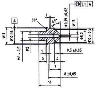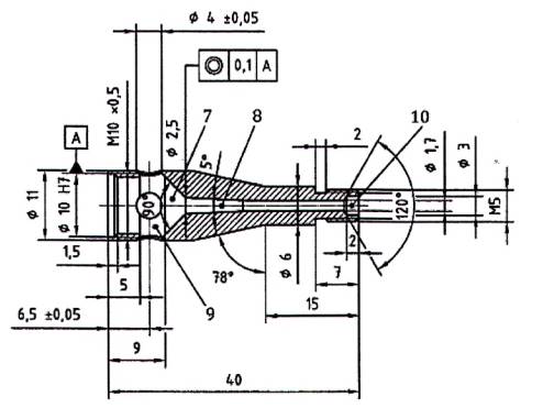 Đường kính lỗ của đầu phun [xem Hình 2 b)] phải là (0,19 ± 0,02) mm. Lỗ phải được khoan và sau khi khoan, làm sạch tất cả các bụi khoan ở cả hai đầu của lỗ khoan mà không lượn tròn các góc.