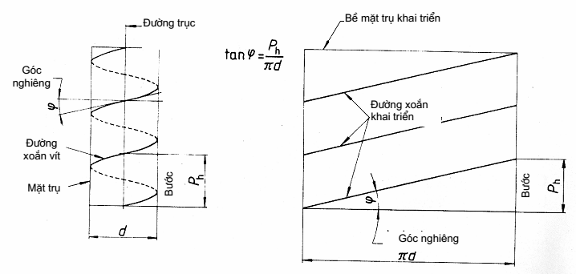2.3. Góc nghiêng của đường xoắn (lead angle of a helix): Góc nhọn (j trên hình 1) là góc tạo bởi đường tiếp tuyến với đường xoắn quấn quanh mặt trụ và mặt phẳng vuông góc với đường tâm của mặt trụ; tang của Góc j bằng bước đường xoắn quấn quanh mặt trụ chia cho chu vi của mặt trụ đó,